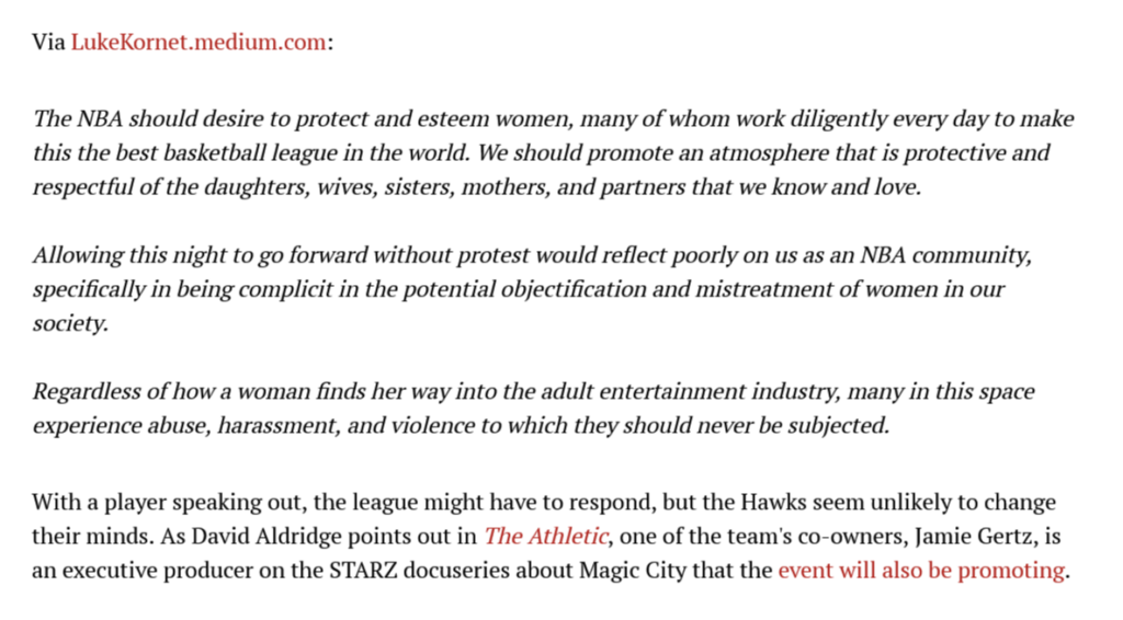 The whole point of Empowerment For The People is to teach women how to promote themselves in the most positive way available. The “stip club” era is coming to an end, because new positive opportunities are available for women that never existed like they do today. Women are free to be “sex trade workers,” if they choose, but better alternatives exist. Look at the exerpts above and look at how Sex Trade Work was going to be brought into a family setting like a professional basketball game. It took basketball player (Luke Kornet) to speak against this happening in Atlanta, GA for it to be stopped. So, chicken wings and strippers were being celebrated at a NBA game and no major figures in Atlanta saw a problem with it?